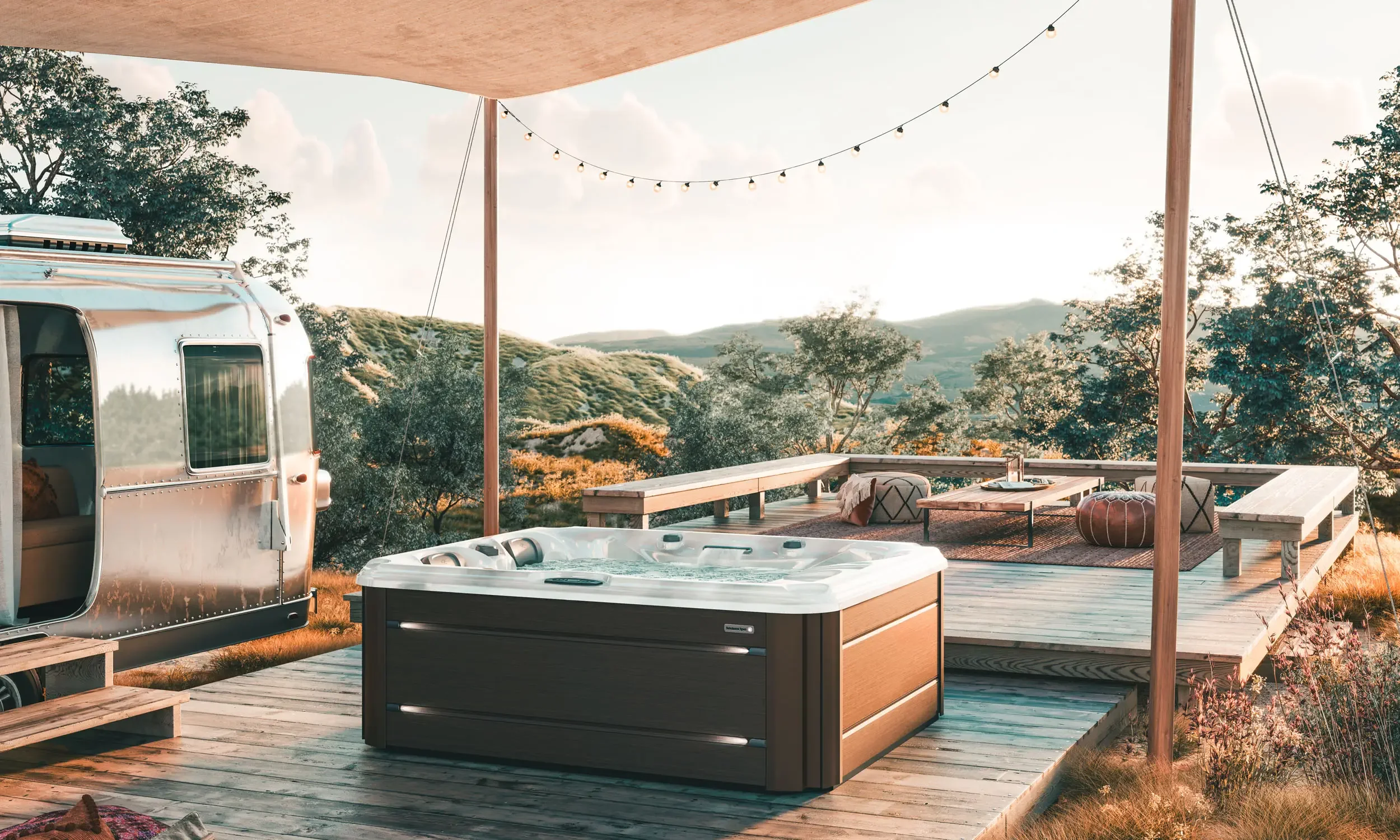 Stainless steel exterior lighting blends with multicolor SunRay™ LEDs that illuminate the spa interior and shine through the AquaSheer™ waterfall. The result is a gentle, shifting ambience that elevates evening soaking and adds a calming visual presence to every session.